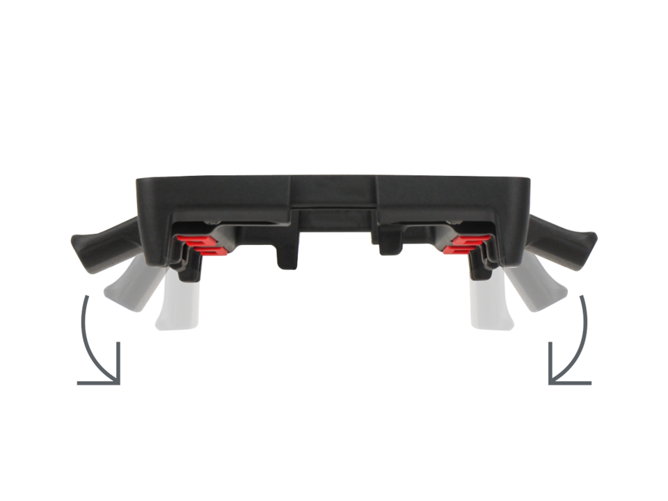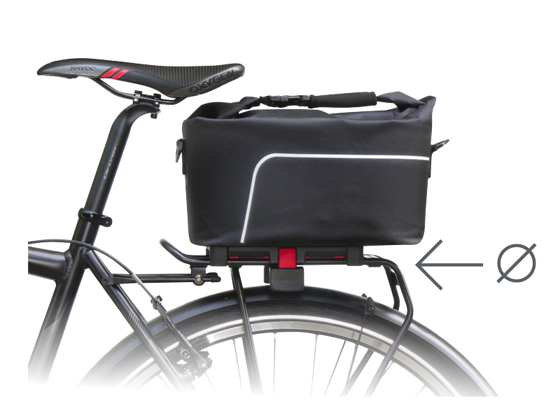 Die vorgespannten Riegel stellen sich automatisch auf den Durchmesser ein und fixieren das Zubehör sicher und spielfrei auf Gepäckträgerstreben mit Ø 8 -16mm. Die Federklappe muss in der Regel nicht entfernt werden.